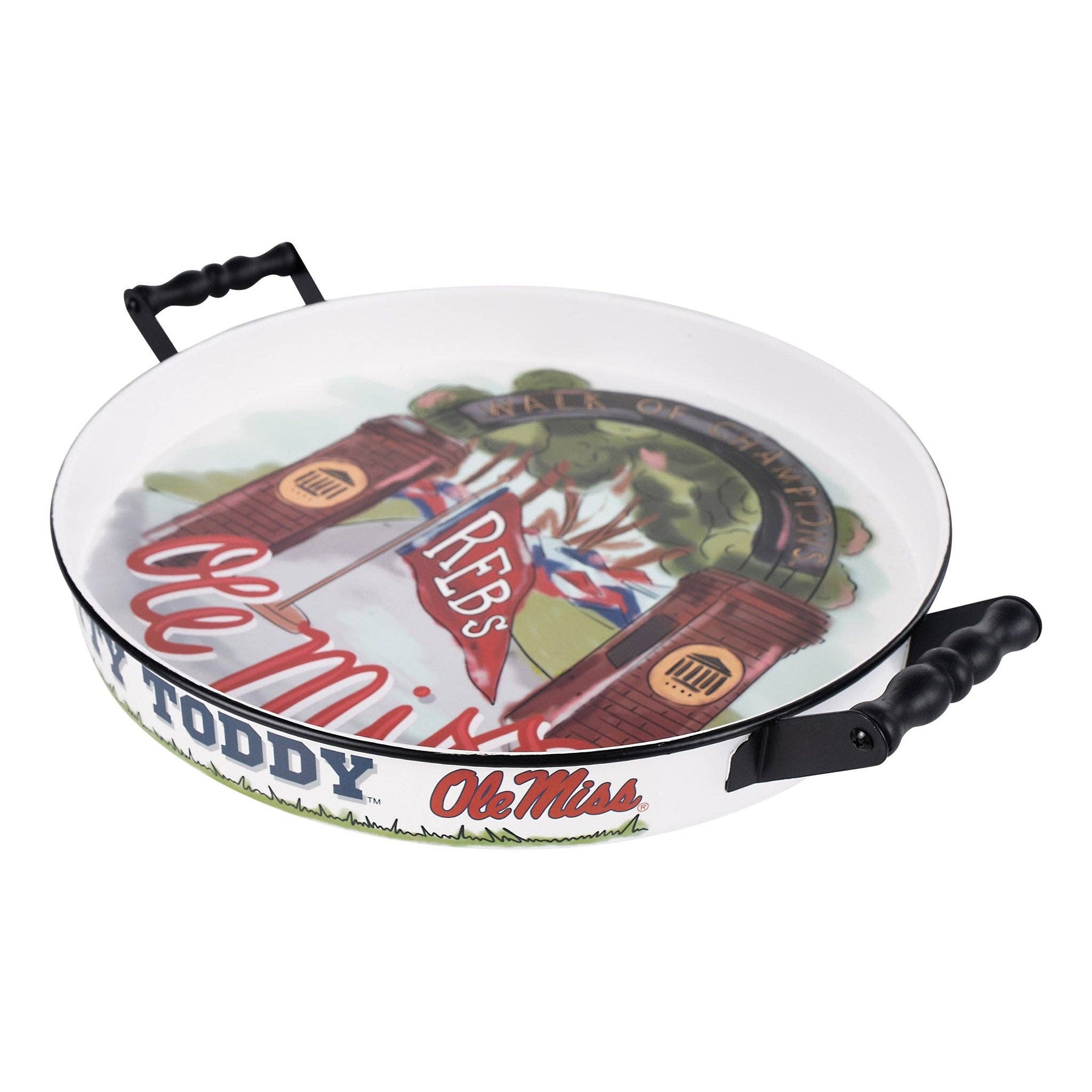 Celebrate with Rebel pride using the Ole Miss Mascot Enamel Tray. Featuring Tony the Landshark and “Hotty Toddy!” on the rim, this enamel tray is great for serving snacks, displaying tailgate favorites, or gifting to Ole Miss fans. A spirited way to say Hotty Toddy all season long.